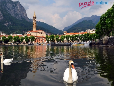 Miasteczko, Włochy, Góry, Jezioro Como, Łabędzie, Kościół