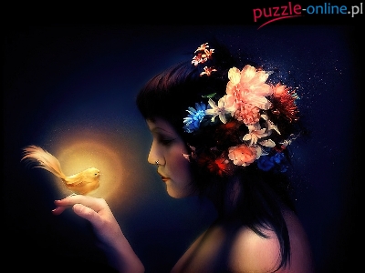 Puzzle Włosy, Kobieta, Kwiaty, Ptak