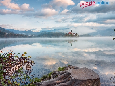 Chmury, Odbicie, Mgła, Góry, Wyspa Blejski Otok, Kościół Wniebowzięcia Marii Panny, Słowenia, Jezioro Bled