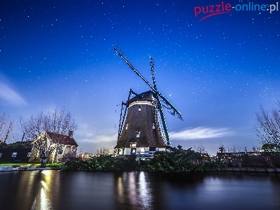 Puzzle Woda, Niebo, Gwiazdy, Wiatrak