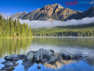 Woda, Drzewa, Góry, Mgła, Kamienie