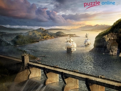 Puzzle Woda, Żaglowce, Most, Góry