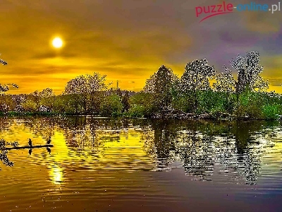 Puzzle Woda, Zachód, Słońca, Drzewa