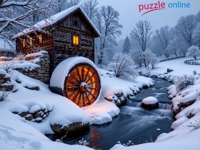 Zima, Rzeka, Młyn wodny, Drzewa, Ośnieżone