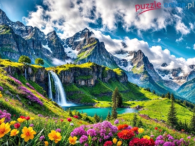 Lato, Dolina, Kwiaty, Wodospad, Grafika, Góry
