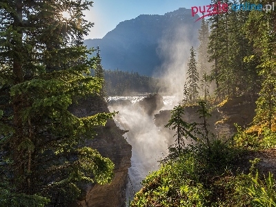 Park Narodowy Jasper, Słońce, Mgła, Wodospad Athabasca Falls, Rzeka, Kanada, Góry, Świerki