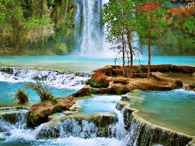 Wodospad, Arizona, Drzewa, Skały, Havasu