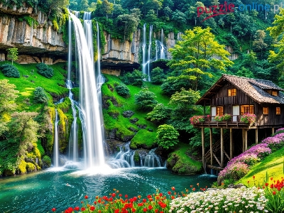 Puzzle Drzewa, Wodospad Skały, Dom, Kwiaty