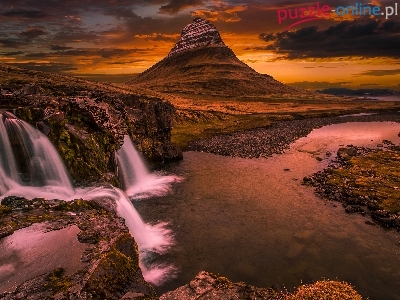 Puzzle Wodospad, Islandia, Góra Kirkjufell, Zachód słońca