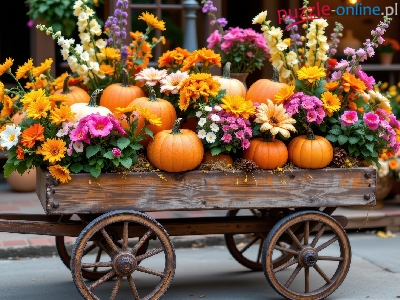 Kwiaty, Wózek, Dynie, AI, Drewniany