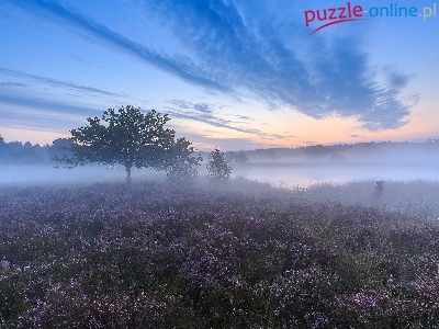 Wrzosowisko, Mgła, Drzewa, Jesień, Pole, Wrzos