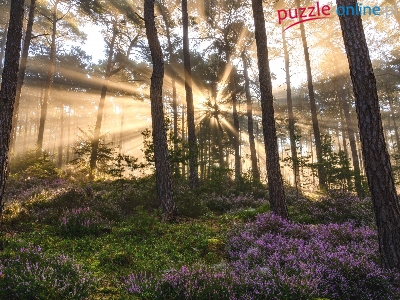 Poranek, Drzewa, Las, Wrzosy, Przebijające światło, Mgła