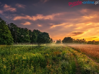 Puzzle Wschód słońca, Pola, Łąka, Drzewa