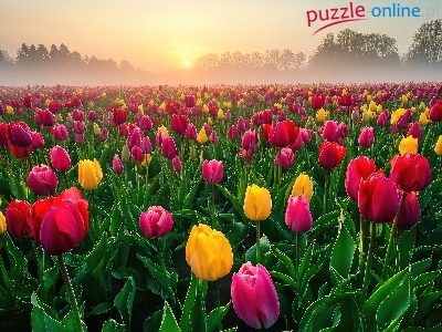 Pole, Tulipany, Kwiaty, Wschód słońca, Drzewa