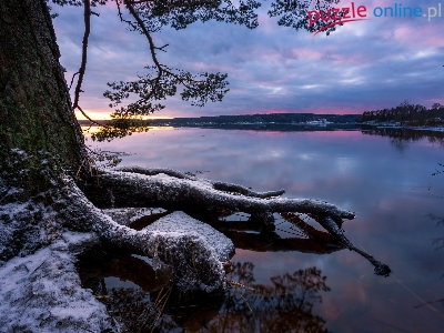 Wschód Słońca, Korzenie, Zima, Jezioro, Drzewo