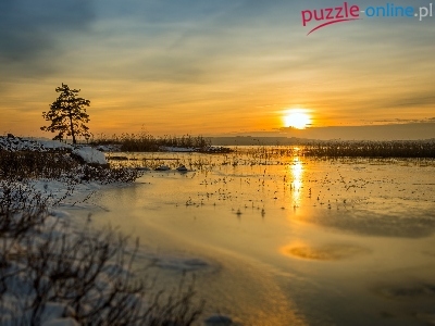 Wschód słońca, Szwecja, Zima, Jezioro Glafsfjorden, Drzewo