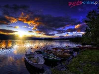 Puzzle Wschód Słońca, Rzeka, Łódki, Chmury