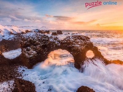 Wschód słońca, Zima, Morze, Skały, Fale