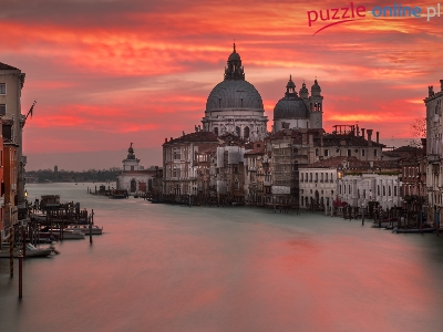 Łodzie, Canal Grande, Wenecja, Budynki, Poranek, Wschód słońca, Włochy, Katedra, Niebo