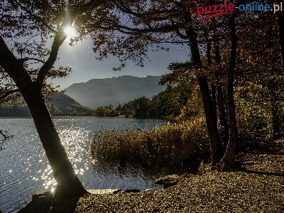 Wschód słońca, Drzewa, Jezioro, Świt, Odbicie