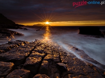 Puzzle Wybrzeże, Morze, Zachód Słońca, Skały