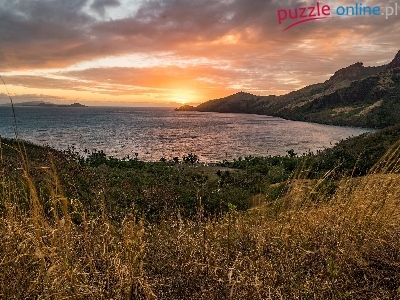 Wybrzeże, Chmury, Morze, Wzgórza, Zachód słońca