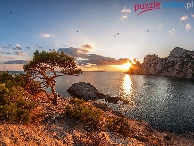 Puzzle Wybrzeże, Morze, Skały, Zachód Słońca