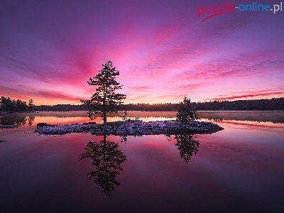 Wysepka, Drzewa, Norwegia, Jezioro, Zachód Słońca