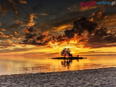 Wyspa, Zachód słońca, Plaża, Morze, Drzewo