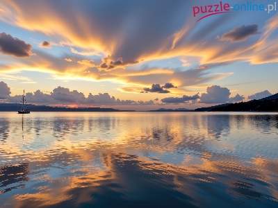 Zachód słońca, Jezioro, Zatoka, Żaglówka, Grafika AI, Wzgórza