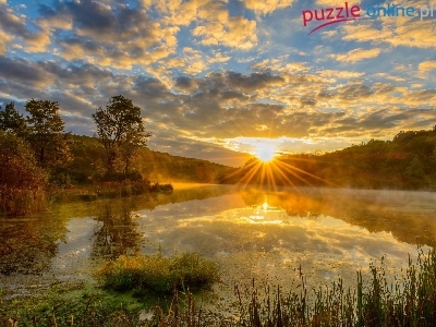 Jezioro, Wzgórza, Drzewa, Wschód słońca, Mgła, Szuwary