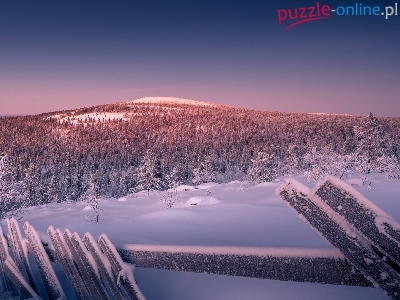 Laponia, Wzgórza, Drzewa, Śnieg, Finlandia, Osada Sallatunturi, Ogrodzenie