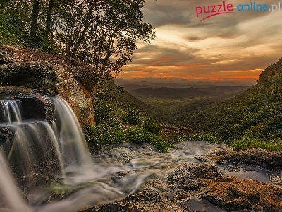 Skały, Wzgórza, Australia, Wodospad Moran Falls, Drzewa