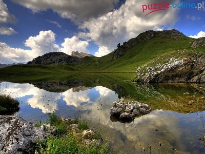 Wzgórza, Chmury, Jezioro, Skały, Niebo