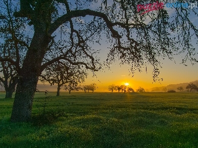 Wzgórza, Drzewa, Wschód, Słońca, Trawa