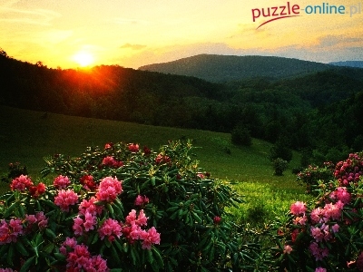 Puzzle Wzgórza, Zachód, Słońca, Rododendrony