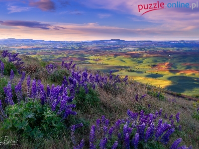 Trawa, Pola, Palouse, Łubin, Kwiaty, Dolina, Stany Zjednoczone, Łąki, Wschód słońca, Park stanowy Steptoe Butte, Waszyngton, Wzgórza
