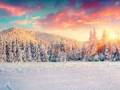 Wzgórze, Las, Zima, Zachód słońca, Drzewa