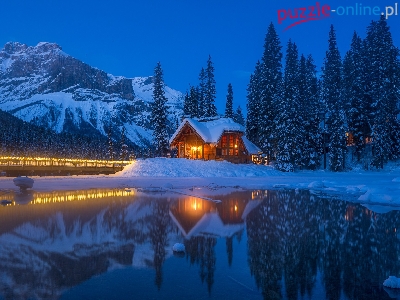 Most, Kanada, Oświetlony, Zima, Emerald Lake, Park Narodowy Yoho, Dom, Góry, Alberta, Jezioro, Drzewa