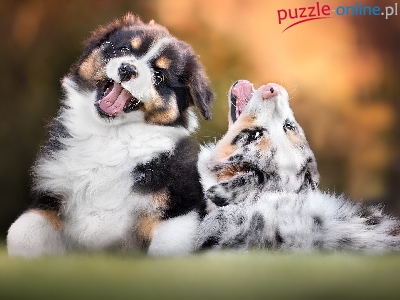 Dwa, Szczeniaki, Psy, Zabawa, Owczarki australijskie