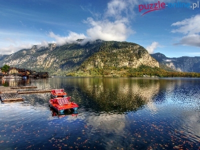 Puzzle Zabudowania, Góry, Jezioro, Pomost