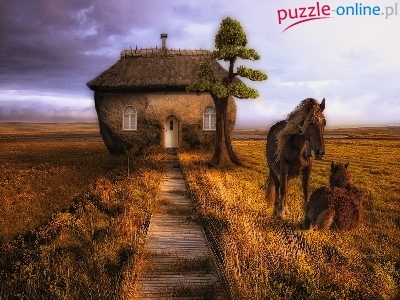 Puzzle Zachmurzone, Konie, Domek, Niebo