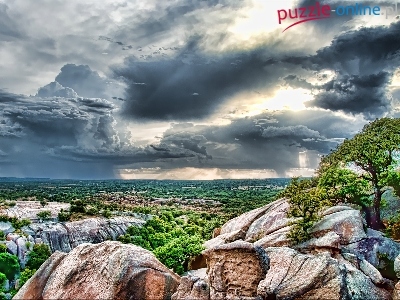 Puzzle Zachmurzone, Skały, Las, Niebo