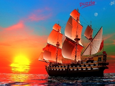 Puzzle Zachód, Morze, Żaglowiec, Słońca