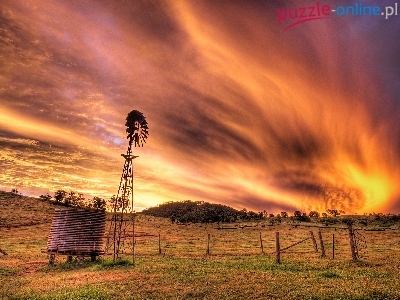 Puzzle Zachód, Chmury, Łąka, Słońca