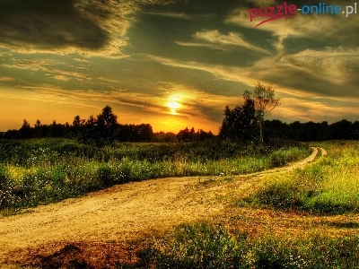 Puzzle Zachód, Droga, Łąka, Słońca