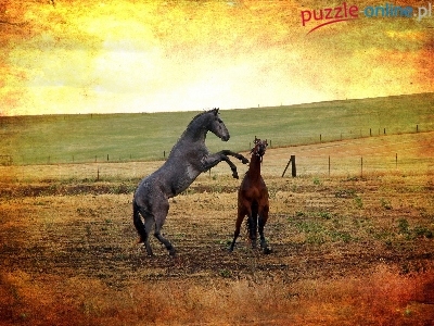 Puzzle Zachód, Konie, Łąka, Słońca