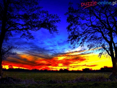 Puzzle Zachód Słońca, Łąka, Chmury, Drzewa