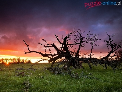 Puzzle Zachód, Drzewo, Chmury, Słońca