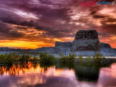 Zachód, Skały, Jezioro, Chmury, Słońca